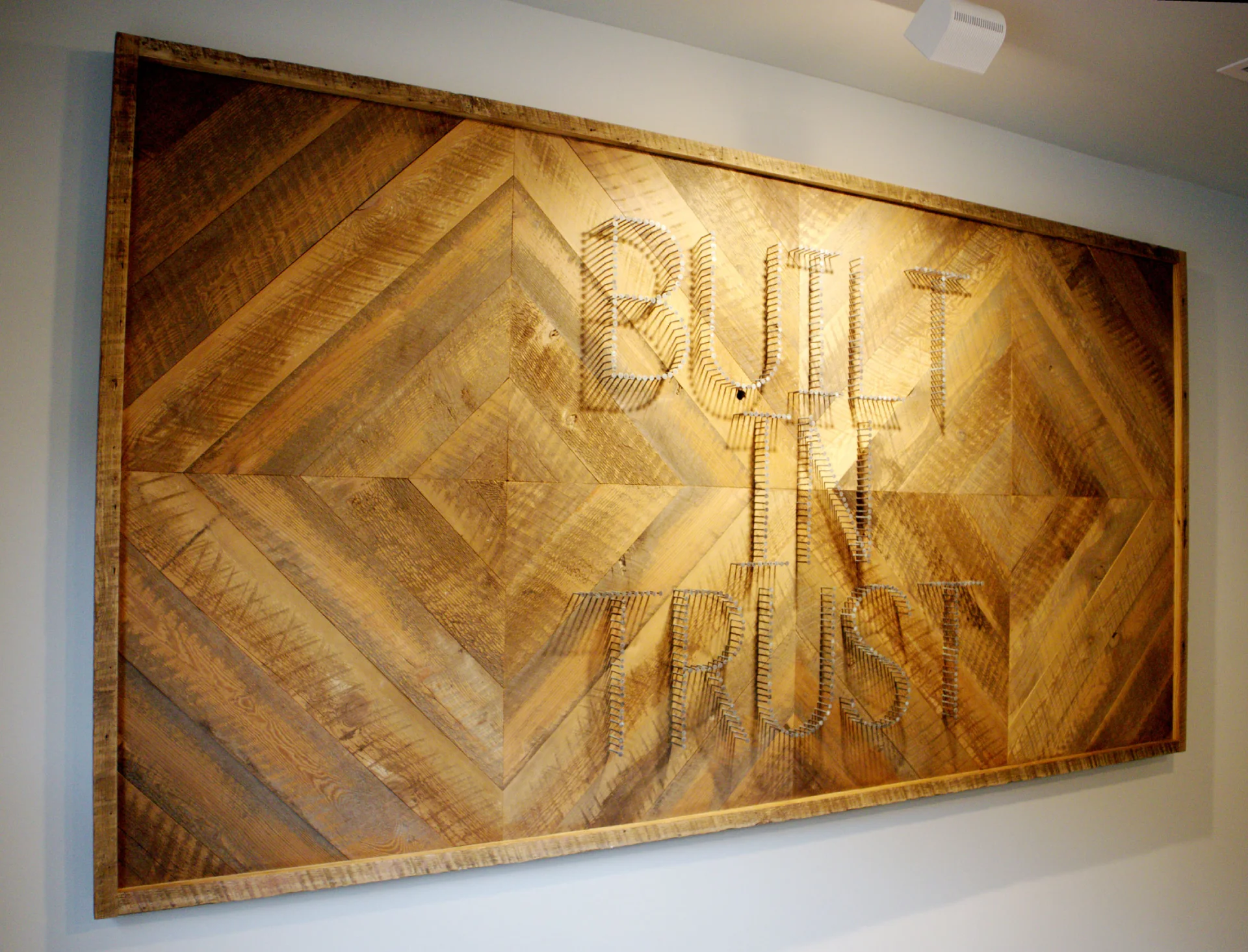 Over the years since, that salvaged wood has found its way into multiple projects: open shelving in clients’ homes, a hanging bed for a front porch, siding on a shed at Sean’s camping property. Most notably, it became the centerpiece of a feature wall in The Hands of Sean Perry’s office, the “Built In Trust” installation, where the letters are formed from nails set into planks of original 37 Biltmore lumber.
